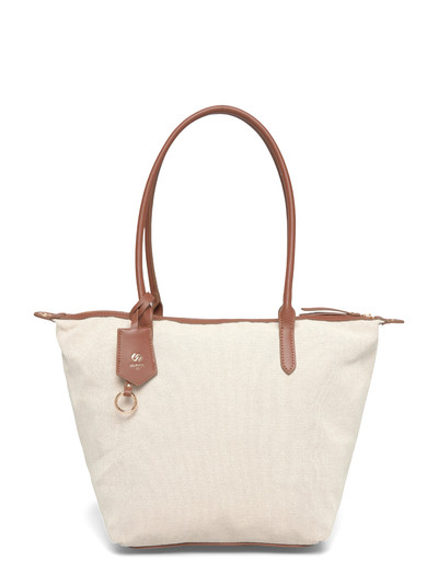 Stylish Canvas Tote with Chic Details. Simple and stylish tote bag in canvas with leather-like details. Two comfortable handles make it easy to carry. Inside you'll find four compartments, one with a zipper , plus a handy outer pocket with a zipper