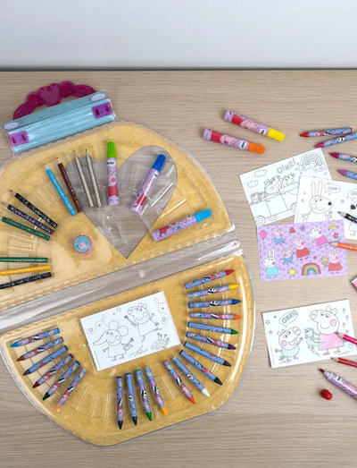 Half-moon-shaped art set with Peppa Pig design, filled with 51 coloring and art supplies. Thanks to the handle, the case is easy to carry and keeps everything well organized. The art set from Undercover includes 12 mini colored pencils, 6 felt-tip pens, 24 crayons, an eraser, 2 mini pencils, a sharpener, 4 posters, and 1 sticker sheet.