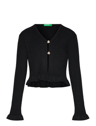 Featuring a ribbed texture, this knit cardigan offers a touch of elegance with its delicate ruffle hem and cuffs. It's finished with button closures.