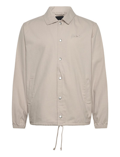Classic coaches jacket crafted from durable canvas. Features include a snap-button front, subtle logo embroidery, and adjustable drawcord hem for a custom fit.