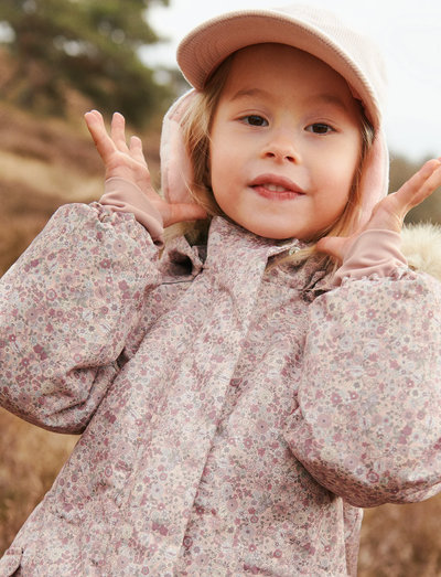 A-shaped technical jacket with print in waterproof and breathable fabric for children.- Lined with soft fleece- Adjustable drawstring at the waist- Pleats on the back- Detachable hood with detachable faux fur- YKK-zipper with chin guard and placket with press buttons- Welt pockets with pocket flaps and velcro closure- Storm cuffs - Reflectors- Hand drawn all-over printWheat's tech jacket is made in breathable, wind- and waterproof material, and is perfect for the many cold autumn and winter days. It is designed with performance and comfort in mind, as the material is durable and dirt repellent and therefore easy to clean and maintain.The technical jacket is intended as a winter jacket, as it has fleece lining and is made to keep your child warm all day long. ---Waterproof: 10.000 mmBreathability: 8.000 g/m2/24 hAbrasion resistance: 50.000 mmStandard 100 by OEKO-TEX®PFC-freeFlourine-free water and soil repellent finish (BIONIC FINISH ECO)Light weighted technical paddingTaped seams---Outer shell: 100% Recycled polyesterPadding: 100% Recycled polyesterFleece lining: 100% Recycled polyesterLining: 100% Recycled polyester