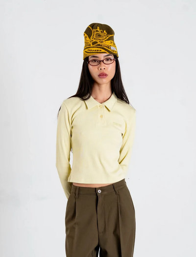 Long sleeved sports top with subtle logo on chest, and a collar with a 2-button closure.