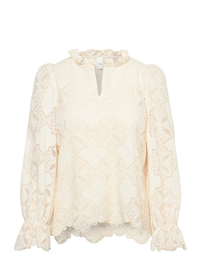 This style is made from a delicate lace fabric with feminine patterns for an elevated look. - Product Type : Blouse - Neck : V-Neck - Sleeve : Long Sleeves (L/S) - Cuffs : Cuffs with elastic bindings - Lining : Polyester lining for a non-transparent look - Extra details : Scallop detail - Fit : Regular Fit