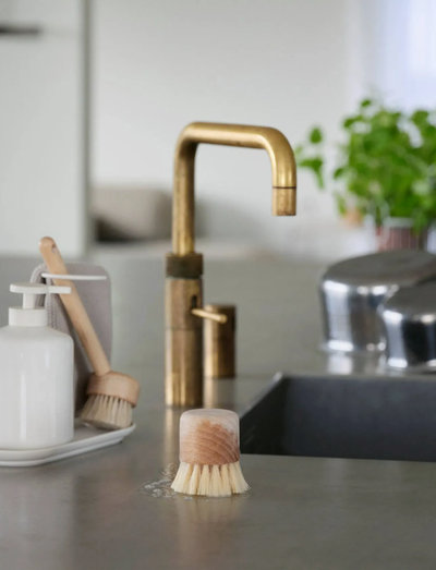 It’s just what you need for your everyday washing-up – nothing more, nothing less. A nice, comfortable brush, a decent sized soap dispenser, a matching dishcloth and a silicone tray to set the scene beautifully. Viewed from above, the steel frame holding the set together curves to form a gentle semicircle, making the set easy to pick up when you want to wipe the worktop, for example. Better still, the frame provides a place to rest the brush and dry the cloth. Thoughtful, dainty and delicate design by NEU Studio.