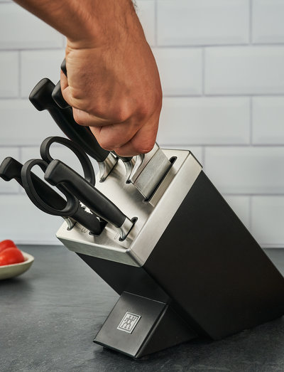 The ZWILLING SharpBlock with KIS technology from the FOUR STARS series ensures optimal sharpness for knives. The self-sharpening knife block set protects your knives against damage and completely removes the need to sharpen them.