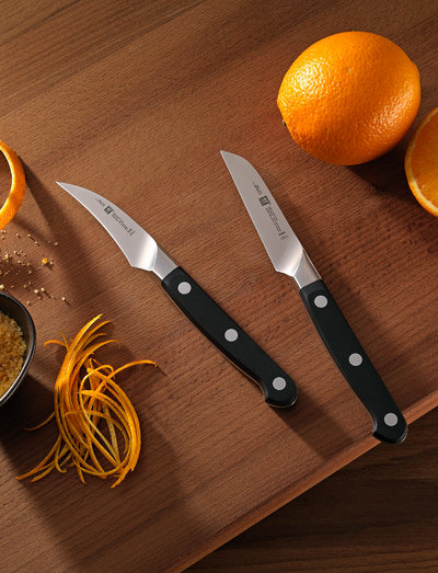 The vegetable knife from the zwilling® pro range is an excellent choice for peeling, cutting or garnishing vegetables. with a blade length of 9cm and a straight, continuous cutting edge, it is ideal for cutting techniques typically used when preparing vegetables. slice tomatoes or cut carrots into thin julienne strips effortlessly with this knife. the sharp blade achieves a clean cut even on soft vegetables. harder varieties can be chopped effortlessly. you can also cut vegetables into decorative garnishes, like cucumber fans, radish flowers or tomato baskets. the knife stands out on account of its precision, stability and corrosion resistance, due to the use of zwilling special formula steel. the knives are precisionforged from a single piece of steel and icehardened to guarantee longlasting sharpness. the curved transition from blade to handle is seamless and the knife is comfortable to hold. the handle made of nonslip, rigid plastic is fixed to the continuous tang with three rivets. the zwilling vegetable knife helps you to prepare delicious vegetable dishes, salads and garnishes quickly and with little effort.