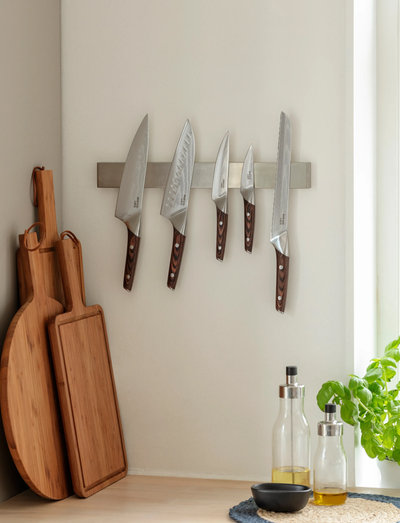 VegetablesThe Nordic kitchen Vegetable knife is specially designed to cut through even the most resistant and hard vegetables. This makes it easy to slice, dice, julienne and batonnet veggies, but also makes it perfect for precision fruit cutting. The blade is forged from 67 layers of Damascus steel (10Cr15CoMoV). The complex manufacturing method results in an exquisitely patterned blade offering an outstanding combination of strength, flexibility and durability. The blade hardness rating is an impressive HRC 60 ±2 to ensure long-lasting sharpness and minimal maintenance. The pakka wood shaft sits stably and comfortably in the hand, while the protective quillon doubles as a natural thumb-rest. A versatile precision knife in a handy size.