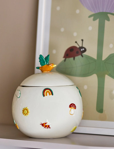 Bloomingville MINI:n Agnes Jar w/Lid on viihtyisä lisä mihin tahansa lastenhuoneeseen viehättävillä hahmoillaan. Kannessa oleva pieni lintuhahmo viimeistelee ilmeen, mikä tekee purkista söpön ja toimivan elementin huoneeseen.