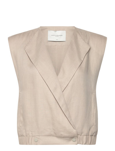 Tämä liivi on valmistettu kevyestä pellavasta, ja se tarjoaa hengittävän ja tyylikkään kerroksen. Mallissa on leveä kaulus ja hienovaraisesti räätälöity siluetti, mikä tekee siitä monipuolisen lisän jokaiseen vaatekaappiin.