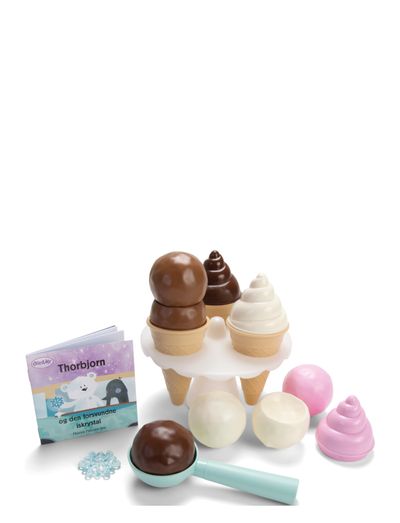 Thorbjorn Frosty Desserts ice-cream set, packed in convenient netting, includes three ice-cream cones, which are combinable in a lot of different ways. The ice cream cones are attractively served in the cone holder included with the set. The set includes the exciting book about Thorbjorn and the lost ice crystal. The magical universe from the book can be transferred to the set, which also contains an ice crystal and suggestions for the hide-and-seek game “the ice is melting”. A splendid set with lots of playing value, stimulating children’s fine motor skills, sense of balance and imagination.