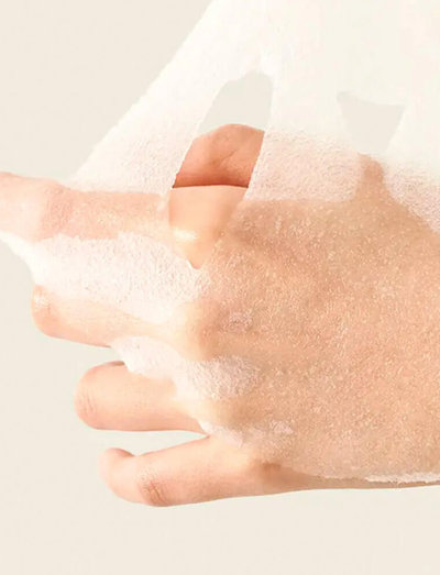 Puhdistuksen ja kasvoveden levittämisen jälkeen ota naamio varovasti pakkauksesta, taita se auki ja aseta se kasvoillesi. Anna naamion vaikuttaa 10-15 minuuttia. Poista naamio ja taputtele ihoa kevyesti, jotta jäljelle jäänyt ydin imeytyy.