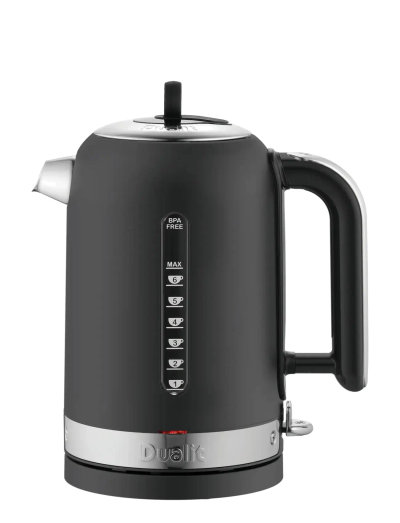 Elegant kettle from Dualit's Classic series in black matte colour with stainless steel details. The handle has been coated with silicone, which provides a firm and secure grip without the risk of burning. The spout has a design that avoids dripping.