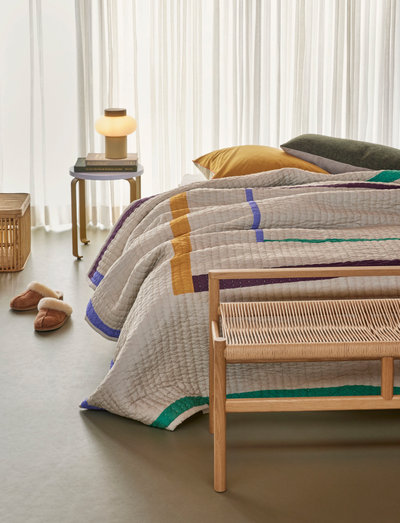 Tikattu päiväpeitto, jossa on vaaleanharmaa tausta ja monivärisistä raidoista muodostuva neliökuvio: Sininen, vihreä, oranssi ja viininpunainen. Selkäpuoli on yksivärinen vaaleanharmaa.