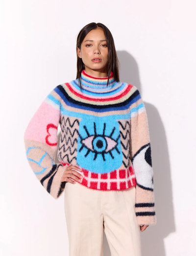 Hunkøn Kitty Blouse is a cropped, soft knit blouse with a playful and colorful pattern.It features a high turtleneck, dropped shoulders, and wide sleeves for a relaxed silhouette.The mix of motifs and vibrant tones gives it a bold, standout look.Please note that knitwear is dynamic by nature and may stretch slightly with use.Kitty Blouse is 100% Nylon.
