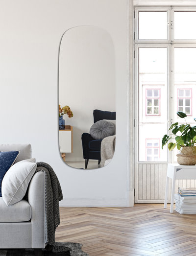 Orgaaninen peili kirkkaasta lasista, minimalistisessa muotoilussa. peili voidaan ripustaa molempiin niveliin ja se sopii kaikkiin huoneisiin.
