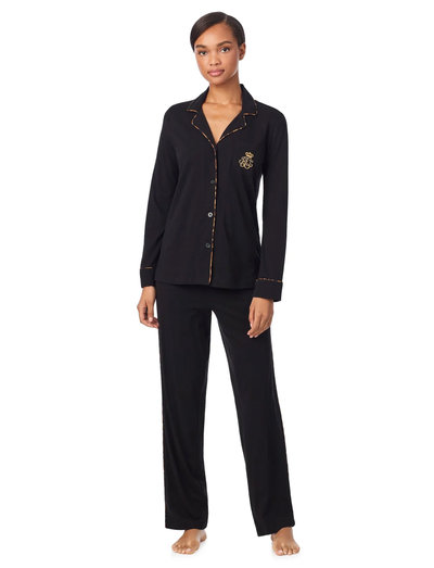 Nauti levollisesta yöstä tässä mukavassa pyjamasetissä. Pitkähihaisessa yläosassa on lovikaulus ja nappikiinnitys, kun taas pitkät housut tarjoavat rennon istuvuuden. Tereyksityiskohdat lisäävät hienostunutta ilmettä.