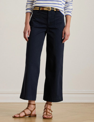 Nämä housut on valmistettu joustavasta puuvillasta, mikä takaa sekä mukavuuden että tyylin. Korkea vyötärö ja leveät, vajaamittaiset lahkeet luovat imartelevan siluetin. Housuissa on vyölenkit ja vetoketjullinen sepalus, jossa on tunnusomainen napitus.
