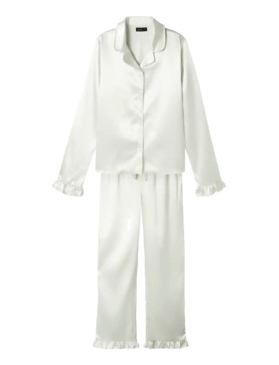 Nuku sikeästi tässä pehmeässä pyjamasetissä. Tässä pitkähihaisessa setissä on babylock-reunakäänteet, jotka viimeistelevät tyylin.