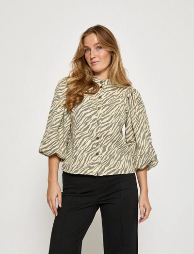 Tässä paidassa on rohkea eläinkuviointi, joka antaa sille erottuvan ilmeen. Sen designissa on pystykaulus ja nappikiinnitys edessä, mikä luo klassisen ja modernin tyylin yhdistelmän. Puhvihihat lisäävät volyymia ja korostavat sen yleisilmettä.
