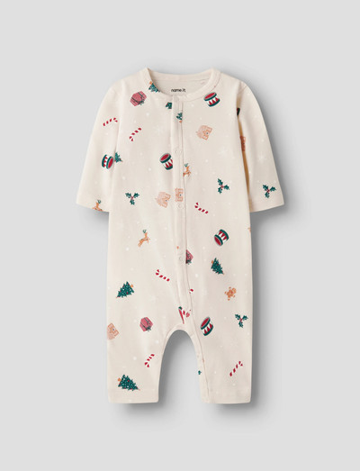 Tässä pehmeässä trikoisessa yöpuvussa on juhlava, kauttaaltaan toistuva kuviointi, joka takaa mukavat yöunet. Pitkähihaisessa mallissa on painonappikiinnitys, mikä helpottaa pukemista ja vaipanvaihtoa. Täydellinen joulunajan juhlistamiseen.