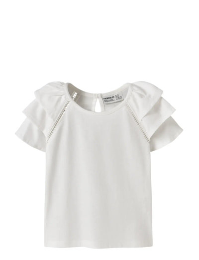 Päivitä lapsesi vaatekaappia tällä hurmaavalla topilla, joka sopii täydellisesti niin arkeen kuin erityistilaisuuksiinkin. Pehmeä jerseymateriaali tuntuu mukavalta ja mahdollistaa vapaan liikkumisen. Siinä on lyhyet, muhkeat hihat, herkkiä pitsiyksityiskohtia ja napitus takana.