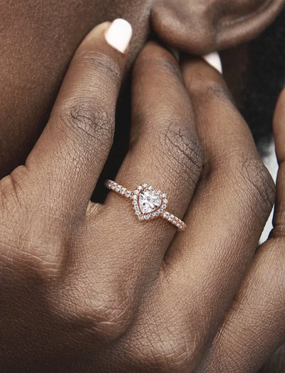 Sydämenmuotoinen, kohotettu kivi antaa tälle sormukselle hienostuneen ilmeen. Käsin viimeistellyssä, 14k ruusukullatussa sormuksessa on kirkas, sydämenmuotoinen kivi, jota ympäröi pienempien kivien kehä. Lisää kiviä koristaa puolta sormuksen runkoa, kun taas varren sisäpuolella on