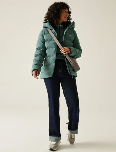 Waterproof and windproof breathable insulated jacket with 300 gsm premium recycled synthetic down insulation. Adjustable grown on technical wire peaked hood, internal zipped security pocket, 2 lower zipped pockets and storm cuffs. Made with recycled content.