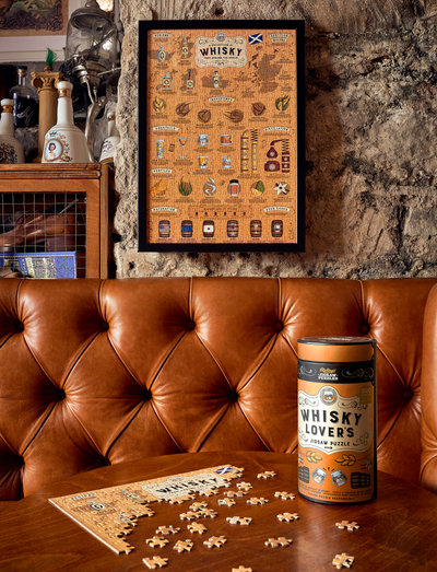 Kaikkien viskin ystävien palapeli, jossa on kokoelma viskialueita, maistiaisia ja cocktaileja! opasjuliste mukana.