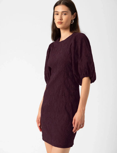 Tässä mekossa on teksturoitu pinta ja puhvihihat, jotka tuovat modernin vivahteen klassiseen siluettiin. Lyhyt pituus tekee siitä ihanteellisen juhliin tai illanviettoihin.
