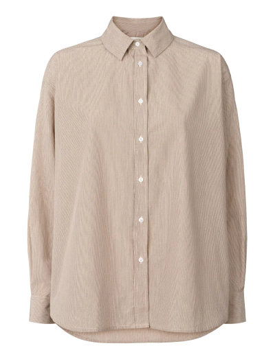 Regular fitTämä paita on valmistettu GOTS-sertifioidusta luomupuuvillasta, ja siinä on ylellinen tuntu huolellisten ranskalaisten saumojen ansiosta. Tässä miesten tyylistä inspiraationsa saaneessa mallissa on klassinen kaulus ja napitettavat hihansuut, mikä mahdollistaa monipuolisen tyylin. Käytä sitä napitettuna tai avoinna ja yhdistä housuihin tai Irene-toppiin rennon ilmeen saavuttamiseksi.