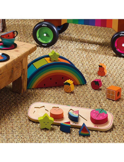 Half-moon shaped shape sorter with rainbow and fruit design and 4 cute blocks.The round shape sorter works perfectly as a stacking toy, and the four blocks decorated as pineapple, star fruit, strawberry and pear have fun and challenging shapes for little fingers.Easy to slide the lid aside to find and store the figures.Develops logic and dexterity in little ones. The little extra? Each fruit can only fit into its own space, which will train patience and concentration. This shape sorter is beautifully decorated by artist Andy Westface. Children from 18 months will have fun with this educational game with many activities, which can also be used as decoration in their room. When you turn the watermelon over, a beautiful rainbow is revealed. Children learn at their own pace to handle the fruits so that they fit into the corresponding holes. Once in place, the pieces can be easily removed thanks to the sliding wooden board. Children will also enjoy playing with the fruit figures in free play, where the shape sorter serves as a support for their imagination.When children play with the wooden shape sorter, they use many skills: concentration, dexterity, motor skills, patience and coordination. They learn shapes, colours and fruits while having fun. Wooden toy, durable Montessori educational toy Development of fine motor skills Development of hand-eye coordination Observe, analyse, understand, experiment Development of imagination, the child tells itself stories Enrichment of vocabulary, the child learns the names of fruitsContents: 1 watermelon-shaped box that swings from left to right, with removable plate for collecting the pieces 4 wooden fruits