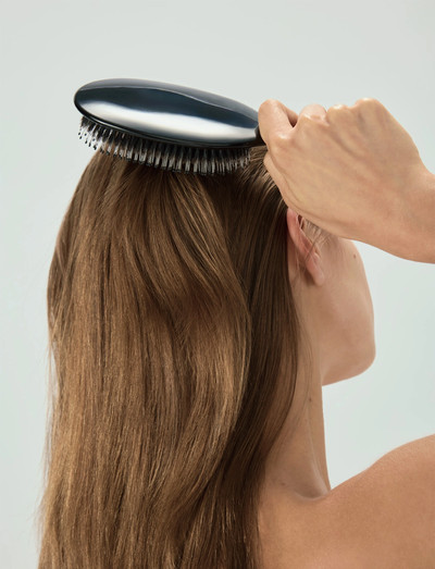 Aloita harjaaminen latvoista ja työskentele kohti päänahkaa kevyin vedoin. Viimeistele hitaasti hieromalla päänahkaa ja harjaamalla juuresta latvoihin jakaaksesi hiusten luonnolliset öljyt, mikä jättää kiiltävän ja runsaan lopputuloksen.