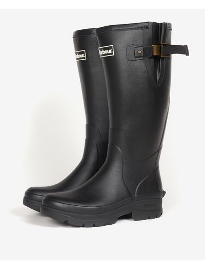 A neoprene lined wellington boot with brass snap faster / side adjuster. Dual density outsole and cushioned in sock.