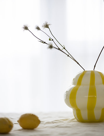 L'art du verre dans des formes douces avec de belles rayures. Le motif peint à la main dans un jaune délicieux rend chaque vase unique, tandis que les volutes arrondies ajoutent une touche ludique et fantaisiste.