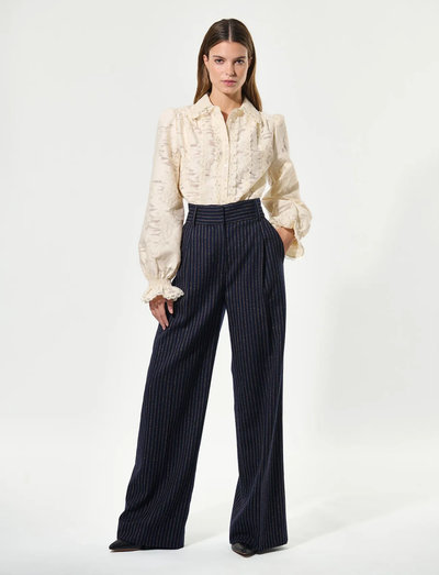 Featuring a flattering wide-leg cut, these trousers offer a sophisticated silhouette. The pinstripe design adds a touch of refinement, making them suitable for both professional and casual settings. Pair with a tucked-in blouse for a polished look.