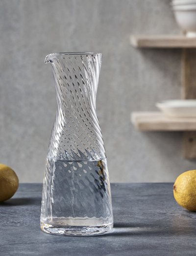 Perfect for serving water, juice, or wine, this ribbed transparent glass carafe adds a touch of elegance to any dining table. its clear design seamlessly fits into various table settings, bringing sophistication to your gatherings. ribbed transparent glass holds 1 litre elegant and versatile finish may varyenhance your dining experience with this exquisite carafe.