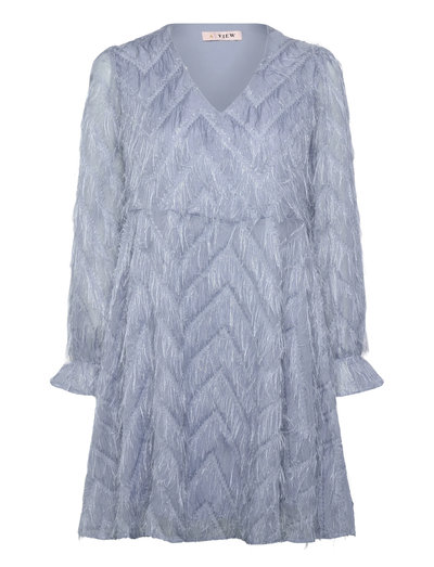 De délicates franges donnent à cette robe courte un aspect ludique et texturé. Le modèle présente un col en V flatteur et des manches longues, ainsi qu'une silhouette trapèze décontractée. Le tissu transparent ajoute à sa légèreté et à son aération.