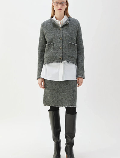 Brandy Jacket is the ultimate jacket for all occasions this autumn. It’s detailed with a structured knit, five black enamel B-buttons, two pockets, and short mohair fringes. This piece can be worn with everything in your closet. Team up with the matching skirt for a co-ord set or style this jacket with a pair of denim trousers.