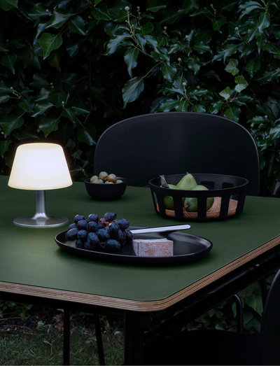 This decorative energy-smart table lamp provides 100% solar-powered, cable-free ambient lighting for your garden table. The lamp has built-in, concealed solar panels with practical features, including dusk-to-dawn sensor (switches on automatically as the sun sets) and power-conserving automatic switch-off after 6 hours. At full charge (8 hours in the sun), the lamp illuminates for up to 20 hours, and it has a rechargeable battery and LED bulb. The lampshade unscrews, and the lamp can be wiped clean with a well-wrung, damp cloth. All-weather design for year-round outdoor use. Made of plastic and steel. Dimensions: H: 16 x Ø: 13.5 cm.