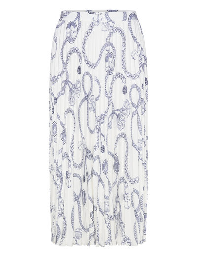 Une silhouette fluide définit cette jupe plissée, ornée d'un imprimé d'inspiration nautique. Le motif intégral présente des cordes, des ancres et d'autres motifs maritimes, apportant une touche de charme marin à votre garde-robe. Les plis créent du mouvement et ajoutent un intérêt visuel.