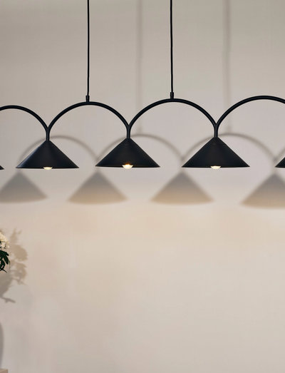 Curve 3 est le résultat d'un jeu de formes géométriques où les arcs doux et arrondis rencontrent les lignes triangulaires tranchantes des abat-jours. cette lampe est parfaite pour être suspendue au-dessus de la table de la salle à manger ainsi qu'au-dessus de l'îlot de cuisine. cette lampe est fabriquée en métal laqué mat avec trois abat-jours en métal, deux câbles en textile blanc de 200 cm de long et une coupelle de plafond assortie en métal. la prise de la lampe pour le raccordement au plafond est vendue séparément.