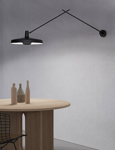 Arigato 45 is a functional wall light with a large shade and striking design. The wall light can be placed in the living room with the lampshade over the coffee table and as a different modern pendant light over the dining table. You can rotate the lampshade 360 °, adjust the lamp from side to side 180 °, and the arms joints are adjustable, so you can easily adjust the light to your need. The light source is hidden under a black diffuser, and it reflects the light from the white inner shade, giving a glare-free and diffused indirect light.
