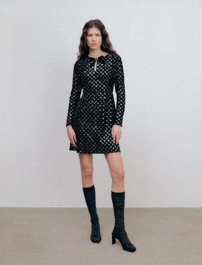 Les sequins scintillants captent la lumière sur cette mini-robe à manches longues. Un nœud en velours à l'encolure ajoute une touche d'élégance à cette pièce idéale pour faire la fête.