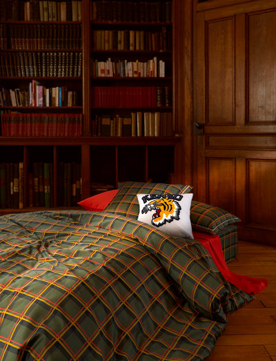 A printed sateen, 100% cotton, 300 TC. Reference to the «Scottish clan», this set of two recto-verso tartans is treated in two different scales and contrasting color themes. The very particular interplay of color twists this classic, and gives it its originality. A touch of white adds an accent of light to it.