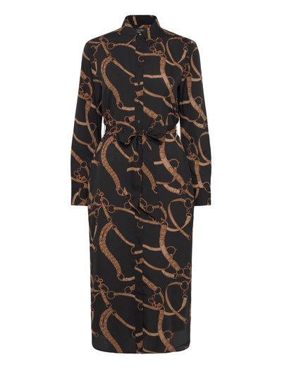 Une ceinture à nouer souligne la taille de cette élégante robe-chemise, créant une silhouette flatteuse. L'imprimé ceinture intégral ajoute une touche d'inspiration équestre. Finition avec un col pointu et une patte de boutonnage.