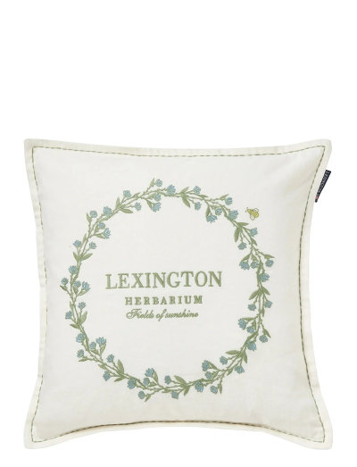 The Wreath Linen Blend Lexington Logo Pillow Cover features an elegant embroidered wreath design with the Lexington logo at the front, adding a classic, refined touch. The pillow cover includes a hidden, color-matched zipper at the bottom and heavy stitching all around for a sophisticated finish. Made in India and Oeko-Tex certified, it's produced in a certified Green Factory Building. Available in white with eucalyptus and blue accents. Size: 50x50 cm. Material: 55% Linen, 45% Cotton. Ideal for a timeless and stylish decor statement.