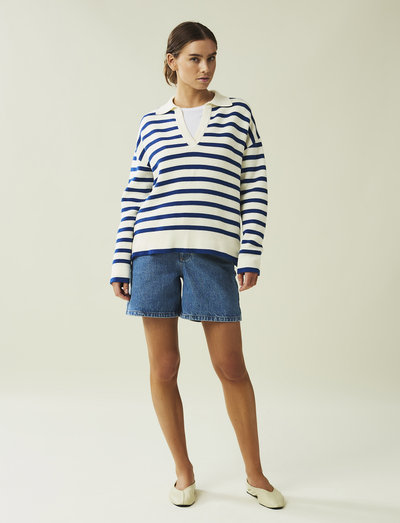 Get ready to elevate your style game in our Peyton full Milano knit sweater. Perfect for the season, its cotton/viscose blend offers lightweight warmth with a luxurious drape, making it your must-have for transitioning into warmer weather. In solid navy or defined by striking horizontal stripes, it flaunts slouchy dropped shoulders for a relaxed style. Pair it with our wide-leg cropped jeans, add a pair of white sneakers, and you've got the best look for spring.