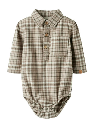 Confectionné dans un tissu tissé avec un motif croisé subtil, ce body à manches longues offre un look propre et classique. Il est doté d'un col de chemise, de fermetures à boutons et à boutons-pression, ainsi que d'une poche avant, ce qui en fait un choix élégant et pratique pour le quotidien. La coupe régulière assure le confort, tandis que l'étiquette ajoute un détail supplémentaire.