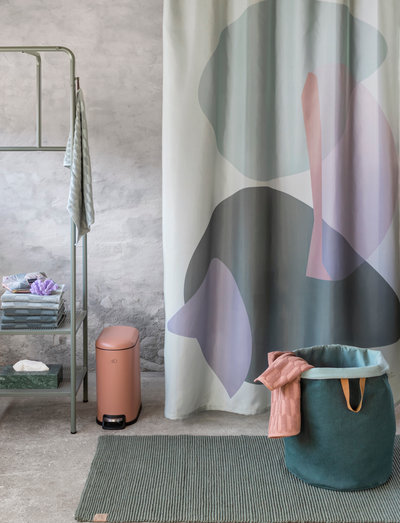 The shower curtain is made of 100% polyester and is mold and water repellent. The shower curtain has black metal rings and is available in sizes 150 x 200 cm.