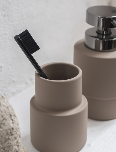 The SHADES toothbrush holder in an exclusive nougat colour combines beautiful, clean lines with a modern design that adds a luxurious touch to your bathroom. Made of ceramic with a matte rubber finish, this holder offers not only a practical storage solution but also a striking aesthetic expression. The matte surface and sophisticated colour create a sense of calm and elegance, ideal for any bathroom decor that values style and functionality.